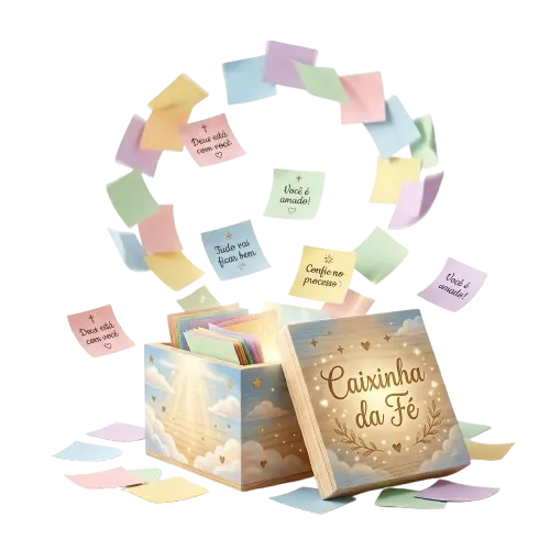 A Caixinha da Fé é um produto digital em PDF — pronto para baixar, imprimir, recortar e montar. São centenas de mensagens de fé cuidadosamente organizadas por momentos da sua vida: tristeza, ansiedade, gratidão, recomeço e muito mais.
